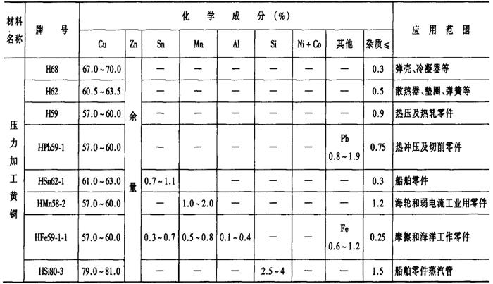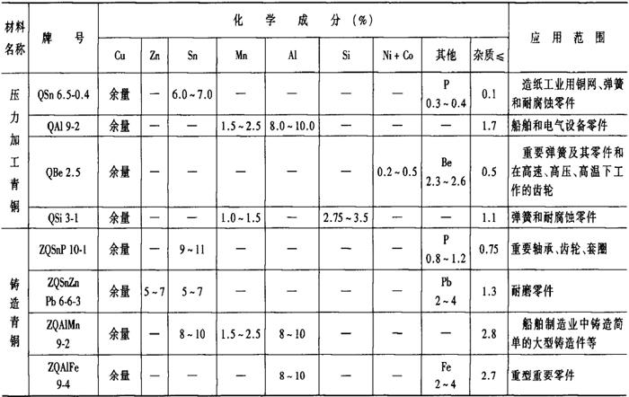 3.青铜 常用压力加工青铜和铸造青铜的化学成分和应用范围见表2-8-5,力学性能及物理性能见表2-8-6。 表2-8-5 常用青铜的化学成分及应用范围[2,3]