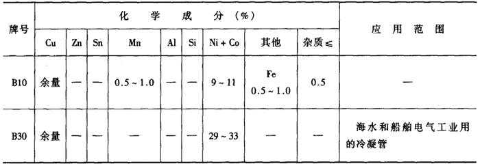 青铜具有较高的力学性能、耐磨性能、铸造性能和耐腐蚀性能,并保持一定的塑性;除铍青铜外,其他青铜的导热性能比紫铜和黄铜低几倍至几十倍,并且具有较窄的结晶区间,因而大大改善了焊接性。 4.白铜 按照白铜的性能与应用范围,白铜可分为结构铜镍合金与电工铜镍合金。结构铜镍合金的力学性能、耐蚀性能较好,在海水、有机酸和各种盐溶液中具有较高的化学稳定性,优良的冷、热加工性。广泛用于化工、精密机械、海洋工程中。电工用白铜是重要的电工材料。在焊接结构中使用的白铜多是含镍10%、20%、30%的铜镍合金,如表2-8-7所示。 表2-8-7 焊接用白铜的化学成分及应用范围[3,4]