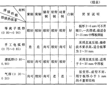 由于铜及铜合金的热导率比碳钢的热导率要大很多(约为5~8倍),焊接时有大量的热量被传导散失,容易产生未焊透及未熔合等焊接缺陷,焊接时应选用高能量的焊接方法。表7.10-4为铜及铜合金熔焊焊接方法的选择。 表7.10-4 铜及铜合金熔焊方法的选择
