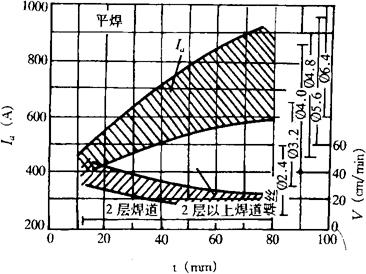 图5-18 铝合金对接大电流MIG焊规范范围 (4)正确选择焊接规范:采用粗焊丝,减小焊接速度和缩短焊接电弧长度。 (5)尽量减小焊接过程中电流的变化,电流超过500A时希望用恒流特性电源。大电流MIG焊铝的规范可参照表5-33和图5-18选择。 表5-33 铝合金大电流MIG焊规范