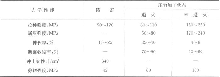 铝的力学性能除与纯度有关外,还与材料的加工状态有关,不同状态的工业纯铝的力学性能见表9.1-1。