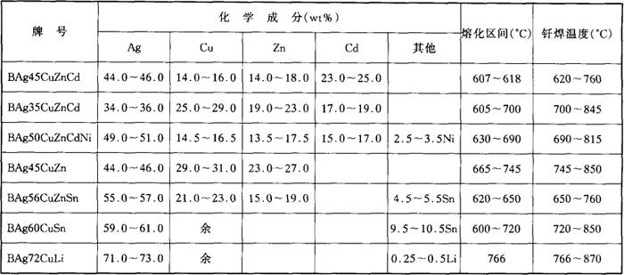 | 释义 | 银基钎料 国家标准中所列银基钎料几乎都可用于不锈钢的钎焊,只有BAg94Al除外,该钎料主要用于钎焊钛及钛合金。在选用钎料时需注意:①含Zn、Cd的钎料及含Mn较多的钎料不能用于真空钎焊;②含Ag量较低的钎料,为不使其熔点过高而大多含Zn、Cd量较高,钎料强度高但塑性较差,用于钎焊承受冲击、弯曲载荷小的接头;③BAg72Cu在不锈钢上润湿性很差,钎焊前不锈钢表面需镀Cu或镀Ni。 钎焊不锈钢常用的银基钎料列于表3-4。BAg45CuZnCd是熔点最低的银基钎料,且在不锈钢上流动润湿性很好,且要求钎焊温度较低,适于钎焊淬火后的不锈钢部件。BAg35CuZnCd含银量较低,比较便宜,适于一般用途的不锈钢钎焊。BAg50CuZnCdNi含少量的镍,可提高不锈钢接头在潮湿空气及水中的耐蚀性。BAg45CuZn不含对人体健康有害的元素镉,熔点适中,在不锈钢上润湿性、流动性很好,钎焊不锈钢接头强度高、塑性好。BAg56CuZnSn是一种不含镉而熔点较低的钎料,而且钎料颜色与不锈钢相同,可用于不锈钢餐具的钎焊。BAg60CuSn不含高蒸汽压元素,可用于不锈钢的真空钎焊或钎焊高真空部件。BAg72CuLi常用于在干燥的氩气中钎焊不锈钢,少量的锂使钎料可还原去除不锈钢表面的Cr2O3、TiO2、Al2O3等氧化物薄膜,促进钎料对不锈钢的润湿。 表3-4 银基钎料