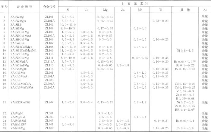 按GB/T 8063-1994规定,铸造铝合金牌号用化学元素及数字表示,数字表示该元素的平均含量。在牌号的最前面用“Z”表示铸造,例如ZAlSi7Mg表示铸造铝合金,平均含硅量为7%,含镁量小于1%。另外还用合金代号表示,合金代号由字母“Z”、“L”及其后的三位数字组成。ZL后面第一个数字表示合金系列,其中1、2、3、4分别表示铝硅、铝铜、铝镁、铝锌系列合金,ZL后面第二位、第三位两个数字表示顺序号。优质合金在数字后面附加字母“A”。