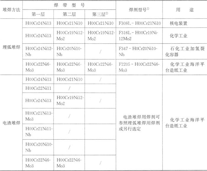 注:①指堆焊表面层熔敷金属的种类代号,具体焊剂牌号可向有关焊剂厂咨询。 ②堆焊层数根据需要而定。 |