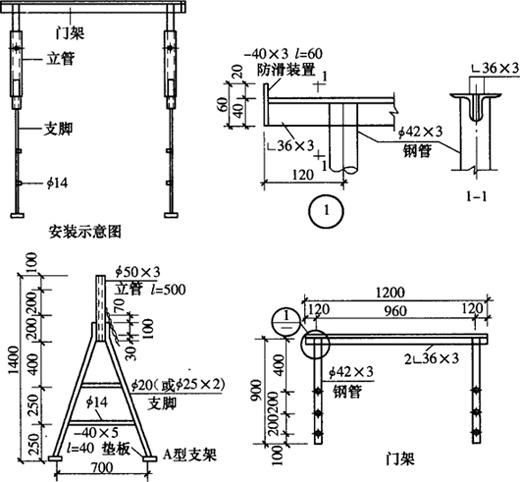 门架式里脚手架是构造比较复杂的一种里脚手架,它主要由A型支架与门架组成,其比较稳定,工作面较大。门架式里脚手架如图4-37所示。