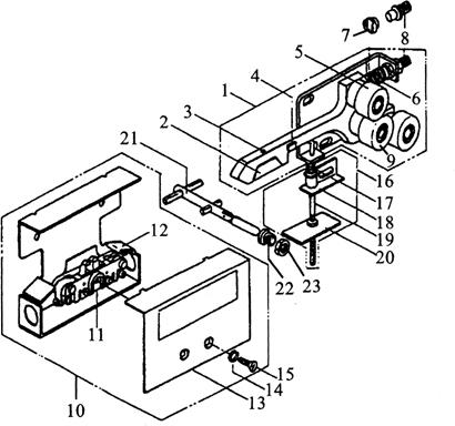 图22.1-3 厅门锁与门锁盒各项间隙结构 A、B、C三间隙应该保证在: A=0~3mm B=13~16mm C=1.5~2mm (1)如果间隙A、B不符合,可以通过调整门锁安装螺栓来调节(图22.1-4),但一般都是通过调整门锁盒上的垫片来调整的。