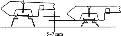 图22.1-1 典型的厅门门锁装置结构示意 1-门闩和滚轮 2-电触点 3-螺丝和垫圈 4-缓冲胶垫 5-滚轮 6-弹簧 7-弹簧座 8-弹簧套杆 9-C形弹簧卡 10-开关盒 11-触点 12-盖套(塑料) 13-门锁盒盖 14-O形垫圈 15-螺钉 16-门锁开启装置 17-弹簧 18-拉杆套 19-拉杆 20-锁匙打板 21-厅门匙 22-锁匙孔 23-螺母 厅门门锁装置至少每半年保养一次,根据运行环境的情况,还应该适当减少保养的间隔时间。 厅门门锁的保养工作需要在轿顶执行,底层的厅门门锁保养需要在轿厢内执行。保养中,尽量切断门锁电源。一般设计良好的电梯电气系统,轿顶和轿内急停开关是在门联锁开关之前的,所以当切断急停后,门锁将不带电;关于此点,请参考实际电梯的电气原理图确定,并且需要在实际操作中使用万用表确定。 厅门是一个整体,本书为了便于表达和查询,将厅门按结构来划分章节,但工作中,切不可分开来对待厅门的部件,应该将厅门作为一个整体来维护,调整每部分的时候,应该顾虑到其他部位。 (一)例行保养 (1)拆下防尘盖板,打开门锁盒盖。 (2)用风筒清除盒内灰尘。 (3)用干净棉布擦拭开关触点,并作下列检查: ①清洁触点的同时,用手按压触点再释放,检查触点是否可以平滑地返回原位;推压的同时检查触点是否有异常声响。 ②如果触点表面粗糙,使用1000#砂纸打磨触点,并用干净棉布擦拭干净。 ③检查触点表面是否因为长期磨损而凹陷,如果有,则需要更换触点。 ④检查开关触点正常动作时的压迫行程,触点的动作距离应该在5~7mm之间,过大的行程将使触点因为过大压迫而过早损坏;而过小的行程,将使触点接触不可靠。适当的压迫行程是必须的,可以使触点相互间产生一个摩擦行程,这个摩擦行程可以使触点间保持自洁而干净和平滑。 门触点行程如图22.1-2所示。