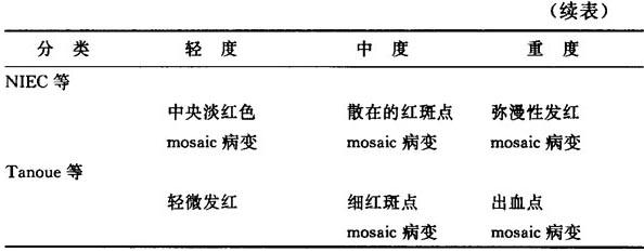 | 释义 | 门静脉高压性胃病 【释义】: 门静脉高压性胃病(portal hypertensive gastropathy)是门静脉高压时胃黏膜出现特殊病变伴有黏膜和黏膜下的血管扩张,而组织学上无明显炎症的病理状态。 【诊断】: 1.临床表现 (1)症状 轻度门静脉高压性胃病一般无明显症状。重度门静脉高压性胃病常引起出血,可呈慢性隐性失血或大量出血。同时有门静脉高压症表现。 (2)体征 无特殊体征,部分患者可有上腹部压痛。 (3)病理诊断 轻型门静脉高压性胃病胃黏膜和黏膜下的毛细血管扩张、扭曲和不规则,黏膜下血管壁不规则,内膜局灶性增厚,胃黏膜可伴有慢性胃炎时的炎性细胞浸润,血管的变化明显甚于炎症改变的程度。重型门静脉高压性胃病,几乎均有黏膜和黏膜下血管的扩张症,胃小凹固有层黏膜血管壁增厚、血管腔扩张。 2.辅助检查 胃镜检查是确诊本病的主要方法,内镜下病情的分类,见表2-4。 表2-4 门静脉高压性胃病根据胃镜下表现的分类