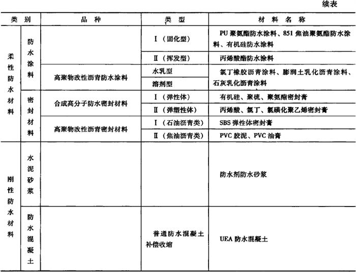 | 释义 | 防水材料的分类 选好防水材料是搞好防水工程的关键,是防水设计水平的具体体现。设计人员应详细了解防水材料的技术指标和性能特点,以便于防水材料的合理选择。 防水材料的种类很多,分类方法也各不相同。我国目前通常将防水材料分为防水卷材、防水涂料、密封材料、刚性防水材料和其他防水材料。其中刚性防水材料主要是指防水砂浆和防水混凝土;防水卷材、防水涂料和密封材料,又分可合成高分子材料、高聚物改性沥青材料和沥青材料制作。防水材料的具体分类如表10-2所示。 表10-2 防水材料的具体分类