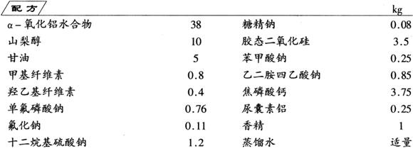 采用湿法溶胶制膏工艺。将除山梨醇和水以外的全部组分混合均匀,在捏合机内将混合料加入水和山梨醇一起捏合成膏状体,制成防牙石牙膏。