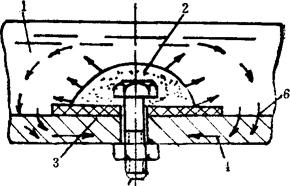 图3-6-19 牺牲阳极保护示意图(箭头表示电流方向) 1-腐蚀介质 2-牺牲阳极 3-绝缘垫 4-被保护设备 5-连接螺钉 6-屏蔽层 (二)阴极保护的基本原理 由图3-6-20可看出,将处于腐蚀区的金属A点和过钝化区的金属D点进行阴极极化,使其电位降低至热力学稳定状态B点和钝化区C点,金属腐蚀即停止。由图3-6-21看出,腐蚀金属微电池的阳极极化曲线φaM与阴极极化曲线φbN交点为S,对应的腐蚀电位,电流为φcIc,外加阴极电流使金属的总电位由φc极化至φ1。此时金属微电池阳极腐蚀电流为Ia1<Ic,即金属本身的腐蚀电流减小,因而得到保护;进一步极化,腐蚀体系总电位降至φa,则阳极腐蚀电流Ia为零,外加电流Ik=If,金属得到了完全保护,此时金属的电位称为最小保护电位。达到最小保护电位时金属所需的外加电流密度称为最小保护电流密度。