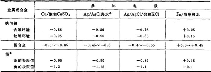 图3-6-21 阴极保护原理的极化图解 可见要使金属得到完全保护,必须把金属阴极极化到腐蚀微电池阳极的平衡电位。 (三)阴极保护的基本控制参数 1.最小保护电位 外加阴极电位等于金属阳极的平衡电位时的电位。为阴极保护控制最主要的参数。一般根据实验确定。表3-6-19为阴极保护采用的保护电位值(单位V)。 表3-6-1 阴极保护的保护电位值(单位V)