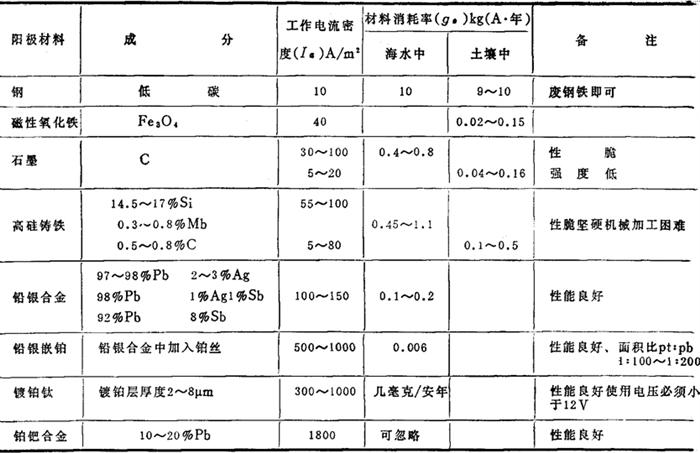 (四)外加电流阴极保护 本系统有辅助阳极、直流电源以及测量和控制保护电位的参比电极。 1.对阴极材料的要求 (1)对介质的腐蚀,在使用阳极电流密度下溶解速度低。 (2)具有良好的导电性,在阳极电流密度大时极化小,排流量大。即在一定电压下阳极单位表面积上能通过的电流大。 (3)有较好的机械性能,便于加工、安装,成本低,易获得。 2.几种常用阳极材料的特性,见表3-6-21。 表3-6-21 常用阳极材料特性