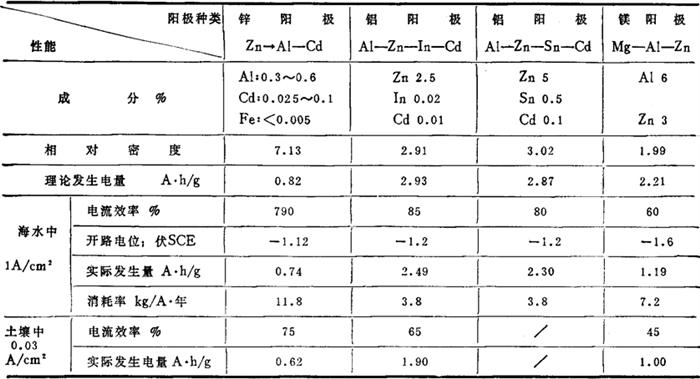 I.为阳极材料允许的电流密度,见表3-6-21或由实验确定。 4.阳极安装注意事项 (1)与导线接触良好、牢固,与被保护设备绝缘良好,更换方便。 (2)当阳极全部浸入介质中时,为防止导线与阳极接头处被腐蚀,应妥善密封。 (3)安装阳极时,要特别注意阴、阳极之间绝缘良好,决不允许短路。阳、阴极与电源的连接方向必须正确。 (五)牺牲阳极保护法 1.对阳极材料的要求 (1)阳极电位要负,即与保护金属之间的有效电位差(驱动电位)要大。通常多用锌、铝、镁三大类合金做牺牲阳极的材料。几种锌基、镁基、铝基牺牲阳极的性能见表3-6-22。 表3-6-22 几种Zn基、Mg基、Al基牺牲阳极性能