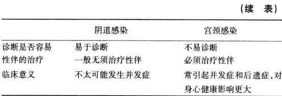 阴道感染和宫颈感染在临床上的意义不一样,正确区分这两类感染是十分重要的。它们的区别见表4-1。