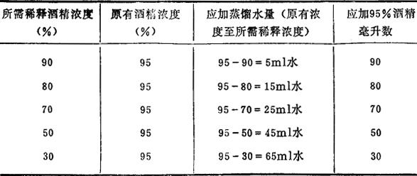 | 释义 | 附件1 常用药剂和染色液的配法 (1)常用药剂 无水酒精、95%酒精、冰醋酸、盐酸、甲醇、正丁醇、二甲苯、甘油、六六六、铁明矾、洋红、碱性复红、偏重亚硫酸钠、吉姆萨、柠檬酸钠、威尼斯松节油、加拿大树胶、秋水仙碱等。 (2)染色液配法 1)醋酸酒精液 取1份冰醋酸,3份无水酒精(或甲醇)配成。 2)盐酸酒精离析液 取浓盐酸1份和95%酒精1份配成。 3)醋酸洋红染液 取45%醋酸溶液100ml,加入洋红1-2g,煮沸约30秒,冷却后进行过滤,然后加入1%-2%铁明矾水溶液数滴,直到此液变为暗红色而不发生沉淀为止。 4)铁明矾媒染液 先用蒸馏水配制成4%的铁明矾水溶液,过滤后备用。因放置一定时间后发生混浊。故不宜大量配制备用,以新鲜配制为主。 5)苏木精染液 分别取苏木精0.5g,无水酒精或95%酒精10ml和蒸馏水90ml。 其具体配法是将苏木精放入酒精中溶解,再加入蒸馏水。此液须1-2个月成熟。瓶口盖以纱布数层或塞一棉塞,以保持通气。临用时过滤。并可直接应用,或者用蒸馏水稀释一倍后使用,可反复使用数次,但每次均需过滤。如不能预先配成,在配制时可加碘酸钠,使其氧化成熟。苏木精0.5g需加碘酸钠0.1g,溶后即可使用。 6)1N盐酸配法 取比重1.19盐酸82.5ml,加入蒸馏水定容至1000ml;或者用比重为1.16盐酸98.3ml,加入蒸馏水定容至1000ml。 7)锡夫氏溶液(亚硫酸复红液) 取碱性复红1g,放入200ml的煮沸蒸馏水中,用玻璃棒搅拌令充分溶解。冷至50℃时过滤,再加入20ml 1N HCl,冷却到20-25℃,然后加入偏重亚硫酸钠(或钾)(Na2S2O5)或无水亚硫酸氢钠(NaHSO3)1-2g,封闭瓶口,置于暗处12-24小时。该液体应成为淡黄色。如颜色过深,可加活性炭2g,振荡后过滤,滤液贮于暗处。 8)亚硫酸水溶液 由10%无水亚硫酸氢钠或偏重亚硫酸钠5ml、1N HCl 5ml和蒸馏水100ml配成。 9)吉姆萨染液 配法1:先将吉姆萨粉末1g溶于66mi纯甘油内,置于60℃恒温箱2小时,再加甲醇(中性,二级以上)66ml混合即可。配制的染液为浓染液或称贮藏液。 配法2:先将吉姆萨粉末3.8g放入375ml甲醇(中性,二级以上)内,待完全溶解后,加入纯甘油125ml,置于37℃恒温箱中48小时,并在保温期间动摇数次,经1-2周后过滤,即可使用。配制的染液为浓染液。 10)磷酸缓冲液(pH7-7.3) 甲液:用蒸馏水溶解磷酸二氢钾(KH2PO4)9.078g,然后加蒸馏水定容至1000ml。 乙液:用蒸馏水溶解磷酸氢二钠(Na2HPO4)9.465g,然后加蒸馏水定容至1000ml。 使用时,取甲和乙液,按一定比例配成不同的pH磷酸缓冲液。 例如配制pH6.98的磷酸缓冲液时,取甲液40ml和乙液60ml;又如配制pH7.2磷酸缓冲液时,取甲液28ml和乙液72ml。 若pH偏低,可加适量磷酸氢二钠水溶液调至所需的pH值;反之,如pH偏高,就可用磷酸二氢钾调节pH。 (3)酒精稀释表 配制各种不同浓度酒精应取95%酒精做原液,用蒸馏水加以稀释。下表列出简便配制方法: