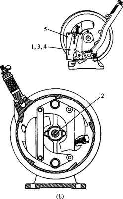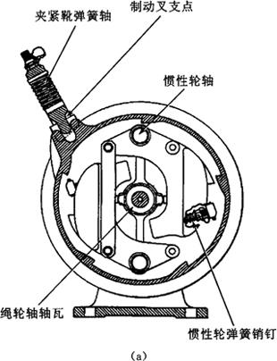 图13.4-1 限速器结构 1-触点 2-绳轮轴(旧的末端还有油孔和定位螺丝的凹槽) 3-弹簧压力开关 4-弹簧触点 5-开关 (一)限速器按结构分类 根据限速器的结构和工作方式不同,限速器可以细分为下面几种: 1.盘式限速器 也称甩块式限速器,是离心式限速器的一种。甩块与限速器轮处于同一垂直平面内旋转。甩块在离心力作用下外移,超速开关动作使曳引电动机断电制动。若轿厢继续加速(指下降运行),则夹绳器夹住限速器钢丝绳,带动轿厢安全钳或对重安全钳动作。 2.甩球式限速器 是离心式限速器的一种,广泛用于高速电梯。伞齿轮带动限速器滑轮旋转,转换成垂直轴旋转,依靠垂直轴顶部连杆机构所挂摆锤的离心力动作。结构较复杂,但检测精度较高。 3.摆锤式限速器 也称凸轮式限速器、惯性振动式限速器,是限速器的一种,属非连续捕捉型限速器。常用的有5星和8星凸轮式。依靠与绳轮同步旋转的凸轮带动由弹簧施力复位的摆锤摆动,若速度达到限定值时摆锤另一端棘爪插入棘轮而锁住限速器绳轮。结构简单,体积小,重量轻,但弹簧易疲劳,动作速度不准确,仅适用于低速电梯。 4.夹绳式限速器 是限速器的一种。动作时夹绳机构夹住限速器绳,提拉安全钳。分压绳舌压轮式和钳块式,其夹绳部分都是自锁的。 5.偏心叉锤型离心式限速器 是夹绳式限速器的一种,属压绳舌压轮式。动作后偏心叉会被转动,安装其上的压绳舌在偏心叉转过一个角度后将绳压紧在限速器轮槽中,夹绳力较大。 6.曳引提拉式限速器 是限速器的一种。无夹绳装置。限速器绳提拉安全钳的力依靠限速器绳与绳轮的摩擦,当限速器绳拉力足够大时,绳会克服其与轮的静摩擦而产生滑移,这与曳引机驱动电梯安全运行的原理相同,故有曳引式之称。 7.连续捕捉型限速器 限速器的一种,属离心式。限速器按速度可随时触发,电梯在任何时刻达到限定速度时限速器即动作而提拉安全钳。不存在因动作间隔而使电梯加速造成安全钳动作需加大能量的危险。 8.非连续捕捉型限速器 即“摆锤式限速器”。当电梯超速达到限速器动作速度时,限速器的转动检速部分仅能在圆周上几个特定的点位动作而制停限速器绳提拉安全钳。动作不稳定,有可能出现超速。 9.双向限速器 电梯超速保护装置。与双向安全钳配套组成升、降双向安全钳保护系统。能上、下双向触发、双向夹绳。由触发机构、夹绳机构、涨紧装置等组成。 10.正弦绳轮限速器 是一种摆锤式限速器,分上摆式和下摆式。属无夹绳装置的非连续捕捉型。设计的理论依据是具有粘性阻尼受迫振动中的共振现象。 限速器作为电梯中重要的安全设备,在保养维护时,应注意以下问题: (1)限速器动作速度。 (2)限速器绳的预张紧力。 (3)限速器绳在绳轮中的附着力或限速器在动作时的张紧力。 (4)限速器动作的响应时间应尽量短。 (二)限速器工作原理 限速器一般都是采用旋转离心力的原理工作。限速器采用安装在限速器绳轮的中心轴上的惯性轮。当轿箱运行时,限速器绳带动限速器轮旋转,产生的离心力使惯性轮向外转动。如果轿厢超速运行,惯性轮继续向外旋转,直到其与棘轮上的凸齿啮合,然后使棘轮作部分的旋转。当棘轮旋转时,其外缘的凸齿与制动叉相啮合,转动制动叉,使夹紧靴贴紧限速器绳,使限速器绳停止跟随轿厢运行,进而使安装在轿厢上的连动装置安全钳动作,停止轿厢在导轨上。 在限速器机械装置动作的同时,限速器上的连动装置还同时切断限速器开关(电气开关),使电梯电机停止运行,防止电梯轿厢停止后电动机还在运行。 限速器工作原理如图13.4-2所示。