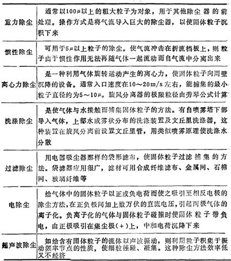 | 释义 | 除尘、除雾设备 在工业生产中除去固体粒状(尘)、液体颗粒(雾)以及杂质气体的过程,称为气体的净制(或净化)。由于采用不同原理进行除尘除雾,因而产生多种多样除尘除雾设备。 1.利用不同原理的各种除尘方法 表16-24 利用不同原理的各种除尘方法