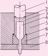 静液挤压示意图1.凸模2、6.密封圈3.液体4.坯料5.挤压筒7.凹模8.座板 |