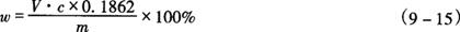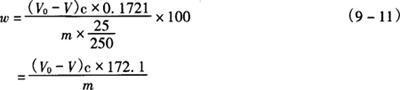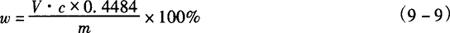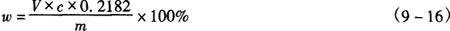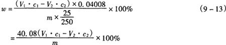 式中 V1——滴定消耗EDTA标准滴定溶液的体积,mL V2——比对试验消耗EDTA标准滴定溶液的体积,mL c1——EDTA标准滴定溶液的浓度,mol/L V——硫酸锌溶液的体积,mL 2.操作步骤 称取0.4g试样,精确至0.0002g,置于100mL烧杯中,加12mL盐酸溶解,移入250mL容量瓶中,加水至刻度,摇匀。用移液管移取25mL试验溶液置于300mL锥形瓶中,加25.00mLEDTA标准滴定溶液,加50mL水、10mL氨-氯化铵缓冲溶液,放置5min,加4滴KB指示液,用硫酸锌标准滴定溶液滴定至溶液由蓝变为紫色,30s紫色不褪即为终点。 同时作比对试验。 3.分析结果的表述 磷酸氢钙(CaHPO4·2H2O)质量分数(w)按式(9-11)计算: