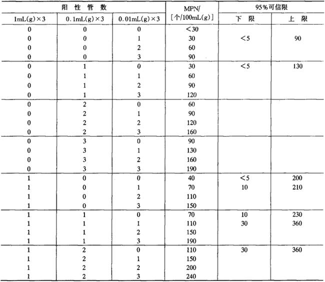 注:①本表采用3个稀释度[1mL(g)、0.1mL(g)和0.01mL(g)],每稀释度3管。 ②表内所列检样量如改用10mL(g)、1mL(g)和0.1mL(g)时,表内数字应相应降低10倍;如改用0.1mL(g)、0.01mL(g)和0.001mL(g)时,则表内数字应相应增加10倍。其余可类推。 (八)粪大肠菌群(faecal coliform) 1.鉴定 用接种环将所有产气的乳糖胆盐发酵管培养物转种于EC肉汤管内,置44.5±0.2℃水浴箱内(水浴箱内的水面应高于EC肉汤液面)培养24±2h,经培养后,如所有EC肉汤管均不产气,则可报告为阴性;如有产气者,则将所有产气的EC肉汤管分别转种于伊红美蓝琼脂平板上,置36±1℃培养18~24h,凡平板上有典型菌落者,则证实为粪大肠菌群阳性。 2.结果报告 根据证实为粪大肠菌群阳性的管数,查表5-3-3MPN检索表,报告每100mL(g)粪大肠菌群的MPN值。 |