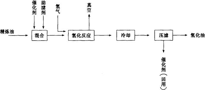 | 释义 | 食用油制品的加工装备 1 概述 油脂精炼后经过再加工,可以得到很多种类的产品及衍生物。其中食用方面,以氢化油为基础的产品应用越来越广泛。例如,各种食品、糕点、冷饮、糖果等对食用油制品的需要量越来越大。但我国每年仅能生产几万吨食用油制品,而且生产基础薄弱,技术水平较低。必须有一个大的提高才能满足社会发展的需要。 在下面内容中将经常提到饱和与不饱和脂肪酸这两个名词,实际上它们都是由油脂分子组成,只是由于油脂分子链中含氢原子数不同而引起油脂特性的不同。例如,硬脂酸为饱和油脂,分子式为C17H35·COOH。油酸为不饱和油脂,分子式为C17H33·COOH。亚油酸为不饱和油脂,分子式为C17H31·COOH。而不饱和油脂通过人工加氢是可以改变的。 2 食用油制品加工工艺 食用油制品很多,本节重点介绍氢化油、人造奶油、起酥油和代可可脂的加工工艺。 2.1 氢化油加工工艺 在一定温度、压力和催化剂作用下,使油脂在氢气中氢化变成饱和程度较高的硬脂,即氢化油的工艺。氢化反应后油脂碘价下降,熔点升高。氢化程度愈高,油脂变得愈稠愈硬,熔点愈高。食用氢化油的熔点一般在37~45℃。氢化过程就是对油脂中不饱和分子的双键加氢,使其达到饱和程度。油脂经过氢化后,稳定性好,有一定的可塑性,是制作起酥油、人造奶油等的原料。制作氢化油要求油脂经过精炼,酸价小于0.5,水分、杂质低于0.5%,含皂量低于0.04%,在20℃下沉淀24h,全部透明无沉淀物,不含硫,氢化标定试验合格。 氢化工艺分为间歇式和连续式两种。 间歇式氢化工艺流程见图1-3-43。其特点如下:①油在密闭的氢化罐内脱气、脱水,能防止氧化与水解变质;②反应过程易控制,每一罐能取得均匀一致的产品;③设备简单,成本低。