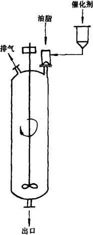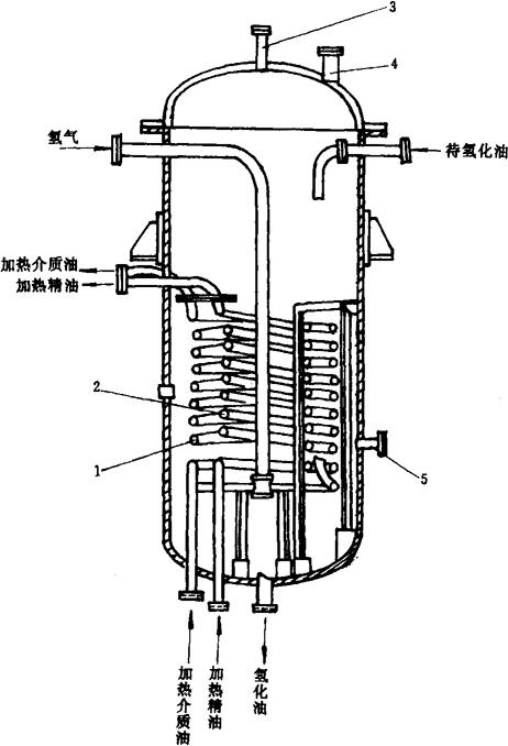 图1-3-47 氢化反应罐 1-过热介质蛇形管 2-热精油蛇形管 3-脱水抽汽口 4-氢气放出口 5-取样口 3.1.2 配料罐(图1-3-48) 该罐主要用途是将催化剂和油脂充分搅拌混合。经混合合格后的油脂才能用泵打入氢化反应罐。催化剂颗粒要求小于100目,采用真空抽吸法进入配料罐。