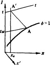 水蒸汽分压线即根据上述方程式绘出。设一个x值,相应求出一个P′水蒸汽。连续假设就可得到许多不同的x值与P′水蒸汽值所构成的交点,连接这些交点得到一条通过坐标原点的曲线,即水蒸汽分压线。 由公式可看出,当总压强P不变时,空气中水蒸汽分压强P′水蒸汽仅取决于x,即对于同一的湿含量x而言,蒸汽的分压为一常数,与空气的温度及相对湿度无关。图中,水蒸汽的分压由等x线与分压曲线的交点求得。 (二)Ⅰ-x图的用法 I-x图上的任何一点,都可以用来确定湿空气的性质,如温度、湿含量、相对湿度、热焓量及蒸汽分压等。 只要知道空气的任意两个参数,在图上把交点找出后,其余参数均可以从图查出。 下面试举几种情况,说明I-x图的用法。 (1)已知干、湿球温度,求空气的湿含量 湿球温度tm(这里可视做绝热饱和温度)的等温线与Φ=1的等Φ线交于A点,沿过A点的等I线上升与干球温度t的等温线交于A′点(由A′至A的过程可视作绝热饱和过程),A点即为已知空气的状态点。过A′点的等x线与辅助x轴相交于x0点,此交点即为空气的湿含量,见图3-4-83。