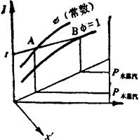 图3-4-85 I-x图用法之三 (4)已知空气的干球温度和相对湿度,求空气的蒸汽分压和饱和蒸汽分压。过干燥温度为t的等温线和相对湿度为Φ的等Φ线相交于A点,A点即为所求空气的状态点。通过A点的等x线与蒸汽分压线相交,然后再沿此交点作水平线,与右端的纵坐标相交,交点即是空气的蒸汽分压P水蒸汽。通过A点的等温线与Φ=1的等Φ线相交于B点,由交点B沿着等x线与蒸汽分压线相交。然后再沿此交点做水平线与右端纵坐标相交,交点即为空气的饱和蒸汽分压P′水蒸汽,见图3-4-86。