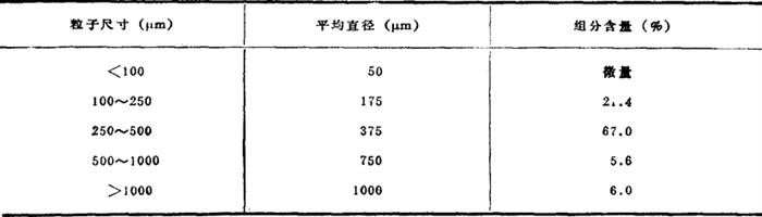 图3-4-86 I-x图用法之四 (三)精盐沸腾干燥计算实例 计算基础: (1)计算条件 被干燥物料 精盐 生产能力 G0=9(t/h) 干燥前水分 W1=3%(湿基) 干燥后水分 W2=0.1%(湿基) (2)物料性能 干盐比热 Cs=0.92(kJ/kg·℃) 虚比重 Pb=1000(kg/m3) 真比重 Ps=2100(kg/m3) 粒度分布:见表3-4-98。 表3-4-98 粒度分布