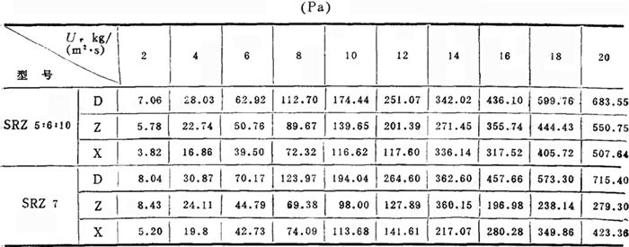 4.93×10-1=H-3.4×10-2In5H ∴H≈0.5m(实际取H=0.4m) (5)流化床层压损⊿P计算 ⊿P=Pb·Z=1000×0.15=150(mmH2O)=1500Pa (6)空气分布板选择 选用风帽布风,风帽间装卵石,高度和风帽上顶平,风帽开孔率40%左右。 (7)辅助设备的计算与选择 ①鼓风机 风量L=A·w·3600=3.9×1.2×3600=17000(m3/h) 风压可根据散热器阻力损失、空气分布板阻力损失、流化床层阻力损失、风道阻方损失等,取H=5000Pa。 根据风量、风压,可从风机产品样本选取离心通风机型号为:9-27-101№10D-3#。风量Q=16550m3/h,风压H=6350Pa,功率55kW。 ②散热器 概述:各型散热器(又称散热排管)广泛应用在热媒为蒸汽或热水的采暖系统中,用以热风采暖、空气调节系统及干燥装置的空气加热等。 根据结构材料的不同,有铜管铜片、铜管钢片、钢管铝片、铝管铝片等种类。 由于各制造厂生产工艺的不同,又有绕螺旋翅片、厚壁铝管挤片,螺旋槽中镶片等类型。 鉴于我国有色金属,尤其是紫铜要用于重要产品上,不能满足散热排管生产的需要,建议选用时优先考虑钢管钢片类。精盐干燥所用散热器一般多为钢管钢片的SRZ型。 SRZ型散热器主要由顺空气流向的三排交叉排列的螺旋翅片管束组成。根据其放热能力大小,分为大(D)、中(Z)、小(X)3种类型,其散热翅片片距分别为5、6、8mm共38种规格。当用蒸汽为热媒时,蒸汽的工作压力为0.6MPa绝压左右。 SRZ型散热器热媒为蒸汽时,在不同空气质量流速Ut下,散热器的传热系数K值列于表3-4-99,空气通过阻力h列于表3-4-100。 表3-4-99 热媒为蒸汽时,在不同空气质量流速Ut下的热风片传热系数K值