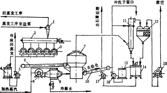 图3-4-88 脱水、干燥流程图 1-盐浆旋流器 2-盐浆高位槽 3-离心机 4-母液桶 5-母液泵 6-湿盐皮带机 7-沸腾干燥器 8-鼓风机 9-空气预热器 10-干盐皮带机 11-湿式除尘器 12-惯性分离器 13-抽风机 14-石膏液搅拌桶 15-洗水贮桶 16-洗水泵 17-石膏浆泵
