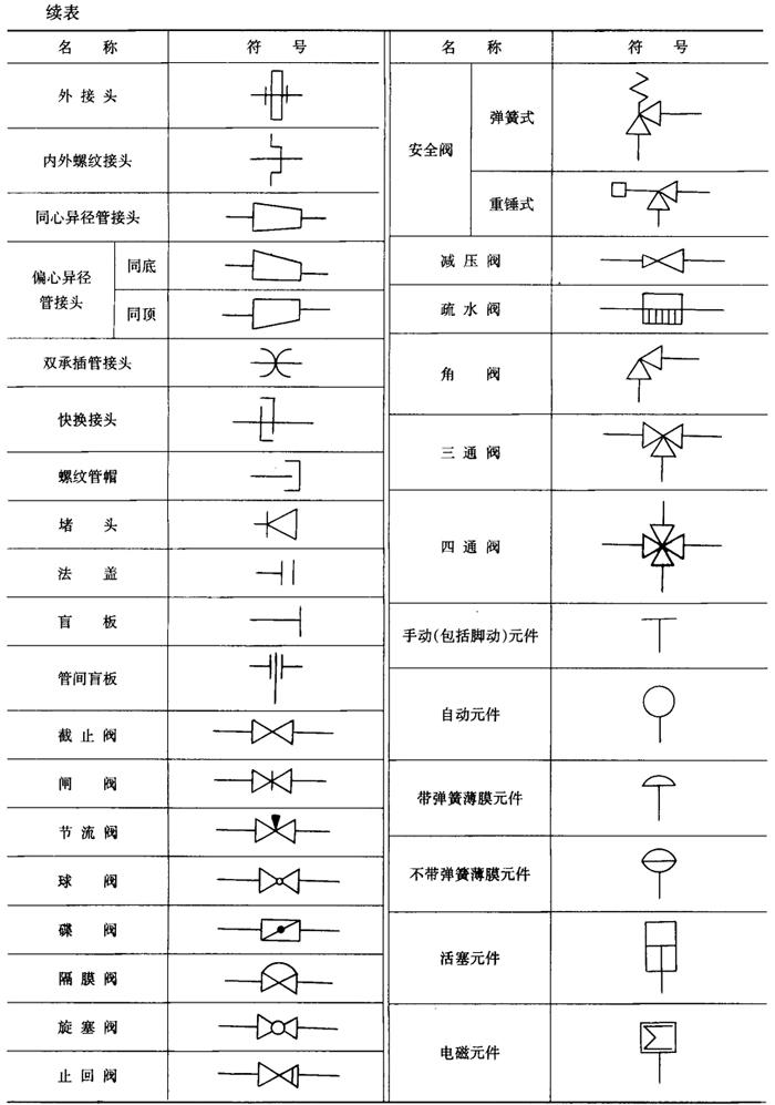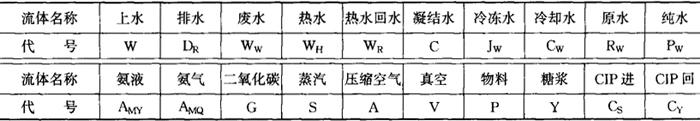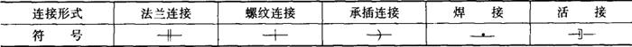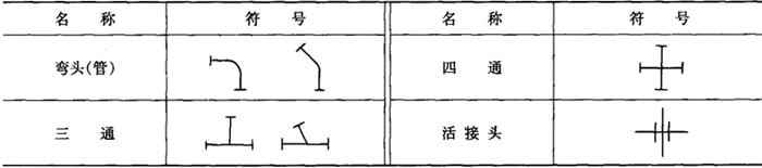 饮料厂管道安装中常见的流体种类及代号、管路连接符号、管件符号分别见表6-4-31、表6-4-32和表6-4-33。
