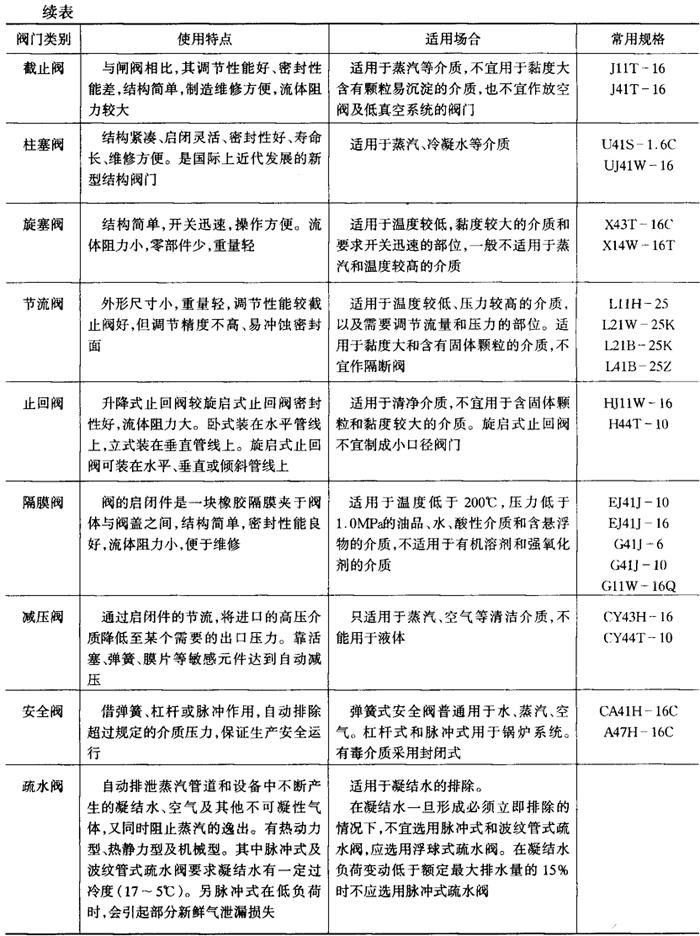 阀门的选用应根据介质的性质和参数,选用质量可靠、操作灵便的阀门。各种阀门的结构特点见表6-4-39。饮料厂的物料管道阀门均使用不锈钢的球阀、蝶阀、旋塞阀。