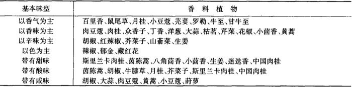 | 释义 | 香料植物及其特征成分 (一)香料植物的分类及其含香部位 通常用作食品调理或饮料调配所用的香料植物统称食用香料植物。由于香料植物能使食品呈现具有多种辛、香、辣等味的特征,故简称香辛料。食用香料植物可分为烹调香草(Culinary herb)和辛香料(Spice)两大类。按其色、香、味的基本类型的分类见表1-4-16。 表1-4-16 香料植物以基本味型的分类