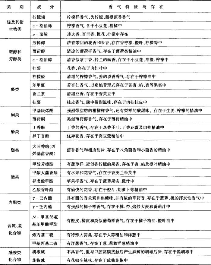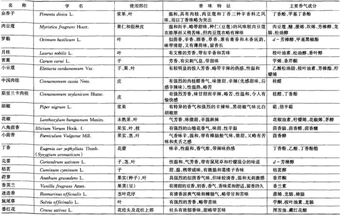 (三)主要香料植物及其特征香味和主要香气成分 主要香料植物含香部位、香味特征和主要香气成分见表1-4-18。 表1-4-18 主要香料植物及其香味特征和主要香气成分