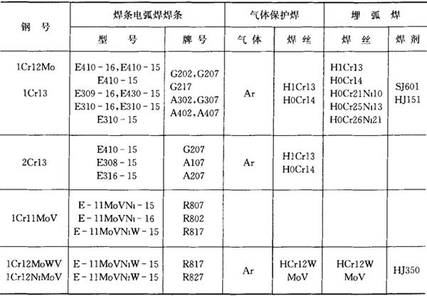 2.马氏体耐热钢的焊接 马氏体耐热钢焊接性比珠光体耐热钢差,主要问题是焊接冷裂纹倾向很大,焊接热影响区存在软化带。此外,还有回火脆性问题。 可采用各种焊接方法焊接马氏体耐热钢。但由于钢的冷裂倾向大,对氢致延迟裂纹非常敏感。因此,必须严格保持在低氢甚至超低氢条件下焊接,同时还应保持较低的冷却速度。最常用的焊接方法是TIG焊和MIG焊。 马氏体的耐热钢焊接工艺特点: ①为了确保接头的使用性能要求,焊缝的化学成分应力求和母材成分相接近。最好焊缝中没有铁素体存在。对于简单成分的Cr13型马氏体耐热钢,焊缝成分调整的余地不大,一般都选用与母材金属相同的填充金属,但必须严格控制C、S、P和Si的含量。减少碳,有利于降低淬硬性;S、P会增大热裂和冷裂敏感性;Si在Cr13型钢中会促成粗大的铁素体组织。焊缝中加入少量的Ti、N和Al则有利于细化晶粒。对于以Cr12型为基的多元合金强化的马氏体耐热钢,由于主要化学成分多为铁素体化元素,如Mo、W、V、Nb等,为了保证焊缝全部为均一的马氏体组织,必须加入适量的奥氏体化元素进行平衡,如C、Ni、Mn和N等。但要注意,增加C和Mn会使马氏体开始转变温度(Ms)明显下降,对防止冷裂纹不利,故其含量需控制在最佳范围。常用马氏体耐热钢焊接材料选用见表7.6-6。 表7.6-6 常用马氏体耐热钢焊接材料选用