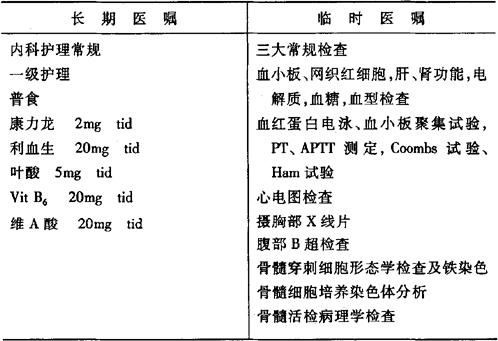 (2)MDS预后差,目前尚无有效的治疗措施,基本原则为积极支持:对症治疗、辅以调整、刺激骨髓造血功能的中西药物和细胞因子(粒细胞集落刺激因子,促红细胞生成素等)治疗以及诱导分化治疗。对高危组患者可采用小剂量化疗或联合化疗。常用小剂量化疗方案有:①阿糖胞苷10~20mg/(m2.d),皮下注射或静滴14~21天;②三尖杉酯碱1~2mg/d,静滴7~14天;③足叶乙苷(VP16)50mg/d,静滴或口服14~21天。联合化疗多采用急性粒细胞白血病化疗方案,且多只用于年轻、一般状况较好的患者。