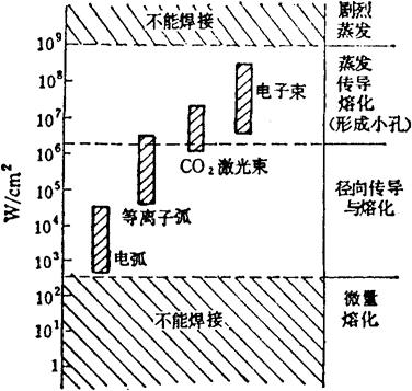 高能束焊接,主要是指能量密度高度集中的等离子弧(束)焊接、电子束焊接、激光(束)焊接。它们的功率密度见图6-1。