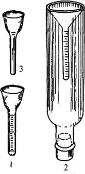 图10-1 采精杯 1.漏斗形集精杯 2.可保温的集精杯 3.实心的漏斗集精杯 输精器有用1毫升的注射器,带胶头的玻璃吸管(图10-2),25~50微升的移液管等等。还有中国农业大学设计的农大型定量、连续输精器(图10-3),操作方便,输精速度快,可以每只母鸡更换1支输精管,避免相互感染。