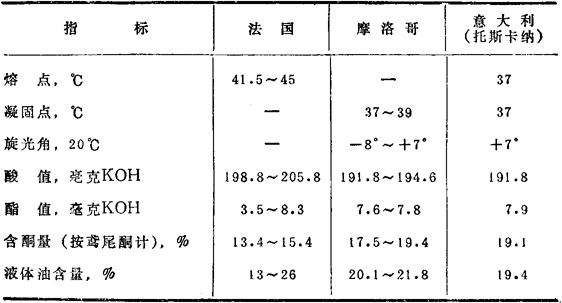 苏联自干根产鸢尾油浸膏的性质如下: 熔点,℃ 40.0~50.0 酸值,毫克KOH 202~208 含量,% 酮(按鸢尾酮计) 6.4~12.4 净油(液体部分) 10.0~12.3 按照TY 18-16-348-74的要求,自发酵的鸢尾根所得到的鸢尾油浸膏质量应当符合下列指标: 密度,20℃*,克/厘米3 0.898~0.918 折光率,45℃ 1.434~1.448 熔点,℃ 36~45 酸值、毫克KOH 175~212 酯值,毫克KOH 16~40 鸢尾酮含量,%,不低于 10 根据美国标准(EOA№116)鸢尾油浸膏的质量应符合下列指标: 熔点,℃ 38~50 酸值,毫克KOH 175~235 酯值,毫克KOH 4~35 含酮量,%(按鸢尾酮计) 9~20 根据TY18-16-91-69鸢尾油浸膏(从法国进口)应符合下列质量指标: 酸值,毫克KOH,不超过 200 酯值,毫克KOH 15~24 含酮量,%(按鸢尾酮计),不低于 10 在50℃时,鸢尾油浸膏能以任意比例溶解在乙醇、苯甲酸苄酯、植物油、矿物油和丙二醇里;不熔于甘油。在无机酸和碱的存在下,则油被破坏。 常用肉豆蔻酸、肉豆蔻酸酯、合成的鸢尾酮、紫罗兰酮,从油-浸膏分离净油时(见下述)得到的油的残留物及其他产物伪造鸢尾油浸膏。 鸢尾油浸膏宜包装在玻璃瓶里,或有特殊内涂层的、容积不超过10升的铝桶里。在温度5~25℃和空气相对湿度不超过70%的条件下,存放在暗处。 鸢尾油浸膏用于香水和花露水香精以及化妆品的加香。 经用钠碱或钙碱处理,从鸢尾油浸膏中分出肉豆蔻酸后,得到的鸢尾净油性质如下: 密度,克/厘米3,15℃ 0.93~0.94 旋光角 +14°~十35° 折光率,20℃ 1.492~1.501 酸值,毫克KOH 1~8 酯值,毫克KOH 15~40 一份体积油在80%乙醇中的溶解度 1~1.5倍体积 鸢尾净油是一种淡黄色至深黄色的流动性液体,它有强烈的紫罗兰香气。如果是用锂盐从鸢尾油浸膏中分离出肉豆蔻酸,则所得到的净油性质如下: 密度,15℃,克/厘米3 0.92~0.945 旋光角 +14°~+30° 折光率,20℃ 1.4950~1.501 酯值,毫克KOH 14~67 酸值,毫克KOH,不超过 2 含酮量(按鸢尾酮计)% 50~70 一份体积油在80%乙醇中的溶解度 0.5~2.5倍体积 各国生产的鸢尾净油的性质见表16.2,苏联生产的见表16.3。 表16.2 各国生产的鸢尾净油的物理化学指标