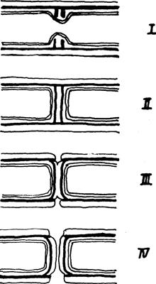 图1-2 超薄切片电镜下麻风杆菌超微结构示意图 1.弥漫外层 2.电子透明带 3细胞核 4.细胞壁 5.细胞膜 6.细胞浆 7.中体 8.空泡 9.多聚磷酸盐颗粒 1.弥漫性外层:约厚16~17纳米,较暗。 2.外壁物质(又称电子透明带):约厚10纳米。可能为菌壁的脂液性腊状物质,或相当于菌胶质。Hanks提出,此膜可能与菌的着染性、抵抗力等有密切的关系,用砜类药物治疗后,ML丧失此膜,通透性亦随之增高。 3.细胞壁:厚约10纳米。有支持作用,并能对抗渗透内压,但无明显的代谢活动。据Draper的研究提示此部分有维持菌的形状和支持抵抗渗透压的作用,对外环境有重要的防御作用。近来研究表明胞壁内含有许多重要抗原成分。 关于带结构(band structure)是Okada1958年提出的。他曾一度研究根据带指数的多少来鉴别分枝杆菌和判断菌的感染力。但目前认为,这是非特异的,其它分枝杆菌(诸如鼠麻风杆菌夏威夷株、鸟结核杆菌和H37RV株结核杆菌)亦发现有带的结构。到目前为止尚未见到带结构与中体问的结构、功能联系的报告,其本质仍待研究。 4.细胞膜:紧靠细胞壁,系双层膜,每层厚约3纳米,为酶的所在部位。现有人研究表明细胞膜为三层,中间一层为电子透明层,其它两层为电子致密层。 5.内浆膜系统:细胞膜嵌入菌之胞浆,形成内浆膜系统。为双层膜的管状结构。此部即为中体(mesosome),可能与细菌的分裂繁殖有关。有人甚至认为即使菌体崩解,只要有中体存在,就能发展成为一条活菌。目前认为ML有横裂与纵裂两种分裂方式。前种分裂方式已趋明晰(图1-3),但后种方式尚不能肯定。