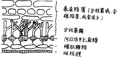 图1-3 麻风杆菌横裂过程示意图 6.细胞浆:其内含有许多10纳米大小的核蛋白颗粒(亦称核膜颗粒),在位相显微镜下则可见到菌体内有急速旋转的颗粒,故认为菌浆呈液态。 7.细胞核:含有脱氧核糖核酸,以不规则形状存在。 二、麻风杆菌的化学组成 定性或定量分析ML的化学组成对ML的分类及鉴定是很重要的,特别是某些成分既特异又具免疫原性,有可能用之发展血清学试验以研究和诊断麻风。 (一)胞壁的化学组成 ML细胞壁中含有分枝菌酸(mycolic acid)、阿拉伯半乳聚糖(arabinogalactan)、缩肽糖脂(peptidoglycan)和脂类,它们都是很重要的物质(见图1-4)。