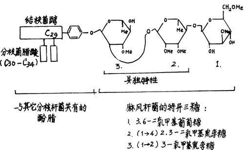 图1-4 麻风杆菌胞壁化学组成示意图 1.分枝菌酸:是一种高分子带有羟基支链的脂肪酸,已发现其它分枝杆菌含有三型分枝菌苷(mycosides),而ML仅含α-和keto-型分枝菌苷,用薄层层析法可以看到。分枝菌酸几乎为整个菌壁重的一半。 2.缩肽糖脂:是一种N-乙酰葡萄糖胺(N-acetylglucosamine)和N-酰荃壁酸(acylmuramicacid)由许多小肽交错相联形成的多聚体。这些小肽在其它分枝杆菌中是L-甘氨酰-D-异谷氨酰基-间-二氨基庚酰-D-丙氨酸(L-alanyl-D-iso-glutaminyl-meso-diaminopimelyl-D-alanine),面在ML中L-丙氨酸(L-alanine)被甘氨酸(glycine)所代替。上述两种胞壁成分,被认为是ML所独有的,能够用于ML的鉴定。 3.阿拉伯半乳聚糖:分枝菌酸与阿拉伯半乳聚糖相联,而阿拉伯半乳聚糖又与缩肽糖脂相联,构成了细胞壁的主体。 4.蛋白类:已发现在ML表面有许多蛋白,其亚单位分子量为53KD(千道尔顿)、43KD和36KD;在细胞壁内ML含有的蛋白类也很多。其亚单位分子量有大于94KD的,也有68KD、59KD和12~14KD的。 5.脂质:ML产生一种特异的脂质,通常与壁相联形成菌的外层或分泌到菌周围环境。这是一种血清学上有活性的酚糖脂(phenolic glycolipidI,PGL-1)(图1-5),虽然与堪萨斯(M.Kansasii)的分枝菌苷A密切相关,但含有独特的三糖(2,3-二-0-甲基鼠李糖、3-0-甲基鼠李糖和3.6-二-0-甲基葡萄糖(Hunter,1981)。该种糖脂既可从ML分离出来,也能从感染ML的犰狳肝分离出来,在瘤型病人皮肤组织中也存在(Young,1981)。这些资料证明,活的ML忌以分泌这种酚糖脂到周围环境同时逐渐蓄积,并可能组成像在瘤型病人巨噬细胞中看到的特有的泡沫物质(foamy material),尤为重要的是这种酚糖脂可以引起免疫球蛋白IgG和IgM类的抗酚糖脂抗体的产生,有望建立诊断麻风的血清学试验。