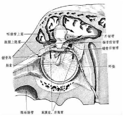 图4-10 鼓室黏膜皱襞(前面观) 3种因素协助此分类。鼓室在其中部缩紧在:①内侧:面神经管及鼓室的鼓膜张肌管的鼓室部分;②外侧:鼓室上隐窝壁之间。其宽度,此处不及2mm。内有听骨链和其肌肉、韧带装置。还有黏膜皱襞,特别是遮盖听骨链到鼓室壁各处的纯系膜是有血管和韧带的。 起初,此装置的全部成分都位于上皮腔的外面。 当发育成长时,它们才进入鼓室铺盖各壁的黏膜自行解脱而出。此黏膜以腹膜方式使其成长。由于形成黏膜皱襞,纯系膜均有血管及韧带。 这些皱襞,尤其是分隔鼓室上隐窝,并使其与鼓室窦分开,穿过鼓室上隐窝-鼓室隔膜的连接孔的皱襞,在3个月前的乳儿是很窄的。 在成年人,鼓室黏膜常很薄,有时缺如。 从手术方面考虑才再分出鼓室房。 一、下层 1 .鼓室房或所谓的固有鼓室 比上层大得多(2~3 cm)。鼓室房的腔相对得要空些。其中可见到:①砧骨长脚、镫骨。②砧镫系膜,尤其是隔开的鼓窦入口下区。砧骨长脚(豆状头)和镫骨(镫骨室)盖帽形成一个二面角,因镫骨肌所致,其棱边呈隆起状;通常极薄,也常缺损。③锤骨前和后韧带以及鼓索,两者将黏膜顶起呈二皱襞。这些也是鼓索神经的系膜或鼓膜。锤骨皱襞(TrÖltsch):这些皱襞同鼓膜紧张部形成鼓膜前、后二隐窝。后者组成两个小鼓室房的憩室,通常与鼓上隐窝不相通。 2.鼓室房的下属部分 根据手术操作方便将鼓室房区分为: (1)中央部:中鼓室,恰为鼓膜和鼓岬。 (2)向后:后鼓室,外侧界于外壁的后鼓膜部分。在这里鼓室可经乳突途径达到面神经隐窝,并看到鼓室腔架。 (3)在下方,下鼓室,外侧界于外侧壁的下鼓膜区。此隐窝有时是颈静脉球体瘤所在地,其可接近骨部外耳道,可看到鼓室腔架全貌。 鼓室房的前鼓膜部,可看成是咽鼓管骨段或前鼓室的延续部分。前鼓室敞开在鼓室房中并非鼓上隐窝中。 二、上层或鼓室上隐窝或上鼓室 它又称上鼓室隐窝或听骨链窝。与鼓室窦相反,上层不太高,尤其是前方,这是其上层填满了由大量骨-韧带形成多发性间隔。 1 .各壁 (1)外壁:骨质,为上隐窝壁所封闭,除其下部外,呈凹状,为鼓膜松弛部所嵌。 (2)内壁:鼓室迷路壁,位于面神经管上方。 (3)后壁:此乃鼓室后壁的锥体上部分,这里有鼓窦入口和鼓窦。 (4)前壁:明显缩小,因为上鼓室终止于咽鼓管口的上角处,实质上它常是个明显的垂直壁。 (5)上壁:即为鼓室盖,向后延续到鼓窦和鼓窦入口顶盖。 (6)下壁:由上鼓室间隔分成两部分。 2.矢状隔(或称上鼓室间隔) 实质上将上鼓室分成两个次室:外上鼓室、内上鼓室。 (1)上鼓室间隔为骨韧带,呈矢状,斜向下内方。在其后1/3连接到外壁上。它在中1/3处分开向前变成正中部。 呈三角形,有:①一个后顶位于鼓窦入口处;②一个前底部,毗邻锤上韧带及其系膜;③一个插入鼓室盖的上缘。 由后向前,它包括:①砧骨短脚;②砧骨体和砧骨上韧带;③锤骨头和颈以及锤骨上韧带。 (2)内上鼓室,是两分室中最大者。 ①位于:向下,迷路壁;向外,上鼓室隐窝间隔;底板仅占前一半,后一半缺如,以上三者之间。 ②在其前半部,骨板由鼓膜张肌腱下面遮盖的系膜构成。此乃方形帆,水平地遮盖锤骨颈到咽鼓管嵴上方,其四邻为:向后,鼓膜张肌腱;向前,咽鼓管上嵴;向内,鼓膜张肌管;向外,锤骨前韧带。 ③向后方,上鼓室借上鼓室-鼓室峡与鼓窦相连。这是一条长6mm,宽2mm的延长裂缝。 毗邻:向前,鼓膜张肌腱;向后,鼓窦入口槛;向外,砧骨体和短脚;向内,在匙突和卵圆窗间的面神经隆起。 ④内上鼓室是一个非隔腔室,它通向:向后,直接与鼓窦入口;向下,经上鼓室-鼓室峡与咽鼓管和鼓室房;向前,由一三角小孔与外上鼓室到后基底部同外上鼓室邻接下方的锤骨前韧带、后方的上鼓室间隔游离缘、上极前方缓缓下降的天盖板。 (3)外上鼓室:比较小且被分割开,呈角形,其终端细长,朝向后方。描述较困难,在后方是砧骨短脚依附的外壁。 ①向前稍扩大,是锤骨头所在地。 周壁:在内侧,上鼓室间隔;在外侧,颞骨鳞部海绵状组织;在下方,上鼓室外壁形成的骨板和内侧的锤骨外韧带。 ②鼓膜上隐窝(Prussak囊)是上鼓室的典型部分。四邻界限:向上为锤骨上韧带,向下为轴韧带和锤骨短突,向外为松弛部(图4-12)。