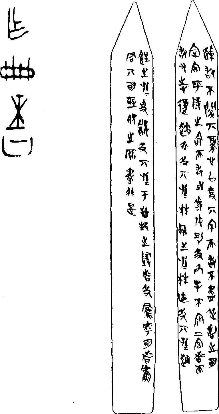 1965年12月,在山西侯马古代晋国境内,出土了一大批共5000多件玉石片,其中有600余片上有较清晰可辨的文字,系用毛笔书写,多数为朱红色,少数呈墨色。书写的内容,一般是春秋战国时代在诸侯与卿大夫之间盛行的订立盟约时向神灵盟誓的誓词,即“盟书”,因此这一批有字玉石片叫做“侯马盟书”(图15右)。经过研究,多数学者认为这批盟书所反映的主盟人赵孟,就是春秋晚期的晋国六卿之一、新兴地主阶级的代表人物赵鞅。这批玉石上书写的字体,带有浓郁的地方特色,属于战国文字。