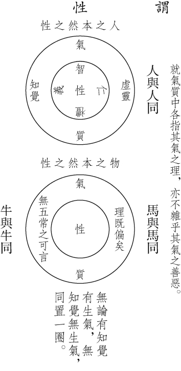 天以陰陽五行化生萬物,得其正通者為人,得其偏塞者為物。其氣正通,故所具之理全而五常備。其氣偏塞,故所得之理亦偏。五常之粹然者,非物之所得以備也。然就其氣中各指其氣之理,而亦不雜乎其氣之善惡,則不害其為本然,故曰‘本然之性’。孔子所謂‘各正性命’,孟子所謂‘犬之性,牛之性,人之性’,周子所謂‘各一其性’,朱子所謂‘偏全之理,形質似者,非指氣質。人與人形質似,牛與牛形質似。其性同;形質殊者,其性異’。人與人同,馬與馬同,牛與牛、犬與犬同,而人之性非馬之性,馬之性非牛犬之性也。若以孟子之説為指氣質之性,則無論其指意之如何。但朱子答嚴時亨書曰:‘孟子言犬之性、牛之性、人之性不同,何嘗言犬之氣、牛之氣、人之氣不同也?’竊意時亨以是為氣質之性,如今日之論,故先生發明孟子之言,只指其本然而非指其氣質也。雖曰云云,其奈朱子之有定論何哉?