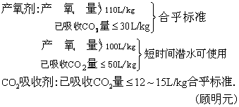 此种产氧剂的产氧效率,如以80%计,则每kg产氧剂可产氧132L; 吸收CO2效率如以60%计,则每kg产氧剂可吸收CO2105L。 CO2吸收剂和产氧剂,平时必须密封保存在阴凉处。使用前要作分析鉴定。 分析原理: (1) 测定产氧剂的产氧量: 在一密封而容积可变的装置(如产氧剂、CO2吸收剂测定器)内,使产氧剂样本与水接触,将化学反应时所产生的氧的体积测量出来。 (2) 测定CO2吸收剂与产氧剂的已吸收CO2量:CO2吸收剂或产氧剂吸收CO2后,均生成碳酸盐。强酸 (如盐酸)可将吸收剂已吸收的CO2置换出来: