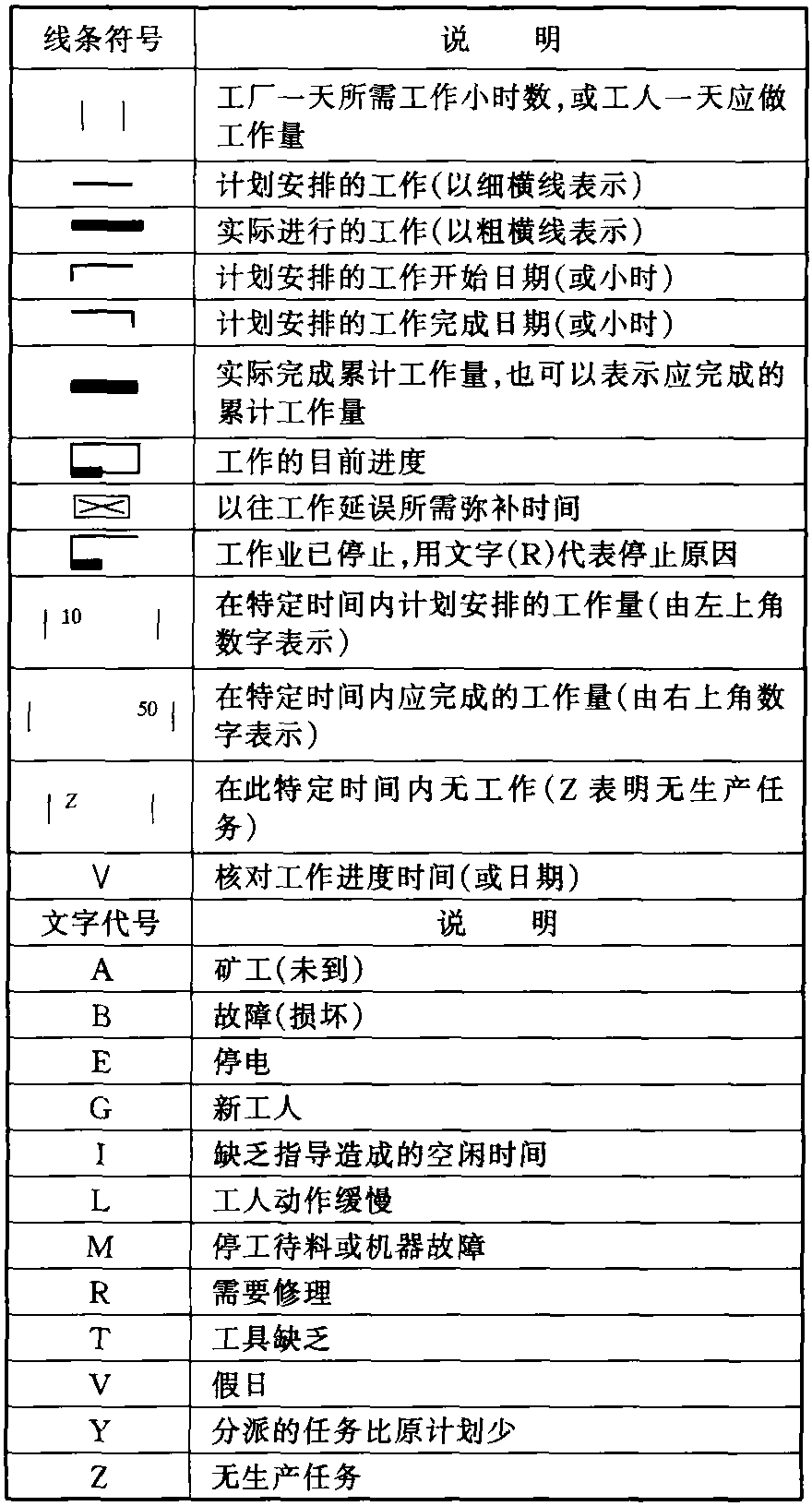 甘特图 又称线条图。是一种对产品生产活动进行计划调度和控制的图表。它具有简单、醒目和便于编制等特点,在企业管理工作中广为应用。图表的横向表示时间,纵向表示机器设备名称、操作人员和编号等。图表内以线条、数字、文字代号等来表示计划(实际)所需时间、计划(实际)产量、计划(实际)开工或完工时间等。甘特图常用的线条符号和文字代号见表2-1。