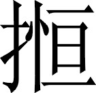 前趋皃。例:有点远,用手~不着。❍ 头仰挈,硬(ɡēn)~着向前看。❍ 路滑向前闪~了一跤。《集韵》:“,前趋皃。”